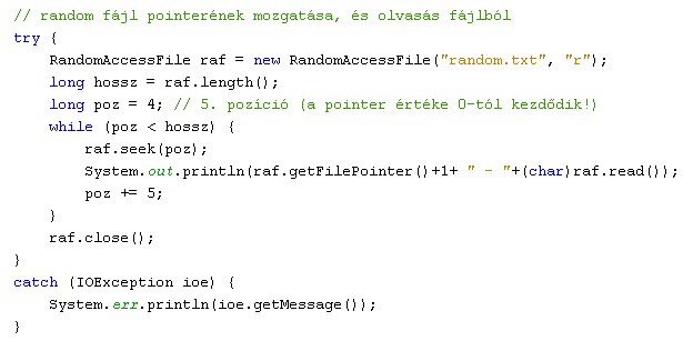void seek(long pos): megadott pozícióra ugrás a fájl elejétől