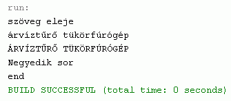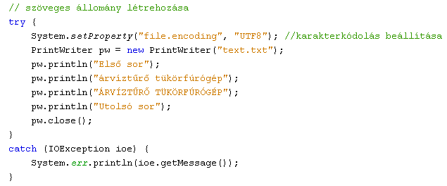 Számunkra most a stringek kezelése fontosabb, ezért nézzünk rá egy egyszerű példát! Írjunk ki egy sima szöveges állományba (text.txt) néhány UTF-8-as kódolású sort, majd az állományt visszaolvasva jelenítsük meg azokat a képernyőn is!