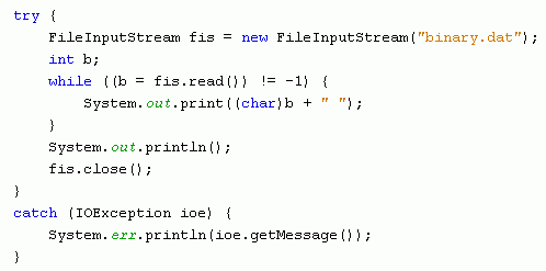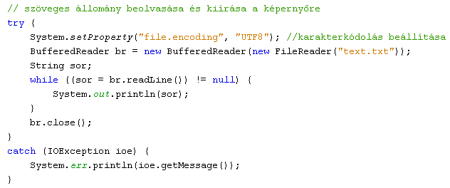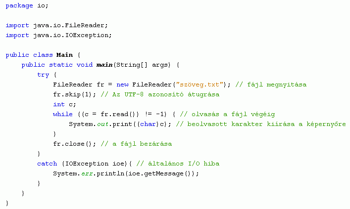 A következő példa egy szöveges állományból egyenként beolvassa a karaktereket, majd megjeleníti őket a képernyőn. Ha nem jelölünk ki pontos elérési utat, akkor a fájlnak a Java projekt főkönyvtárában kell lennie. A fájl végét a -1-es értékkel érzékeli a read() metódus.