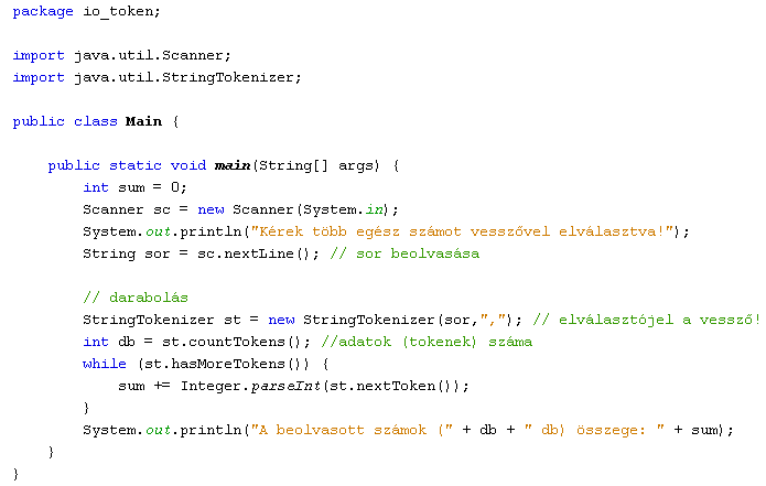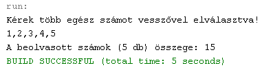 Több szám bevitele esetén a számok közé alapesetben szóközöket kell beiktatni, amely jel a Java-ban felülbírálható. Az alábbi program az előző továbbfejlesztése. Több (akárhány!) egész számot vár - vesszővel elválasztva - a billentyűzetről, majd kiírja a darabszámukat és az összegüket: