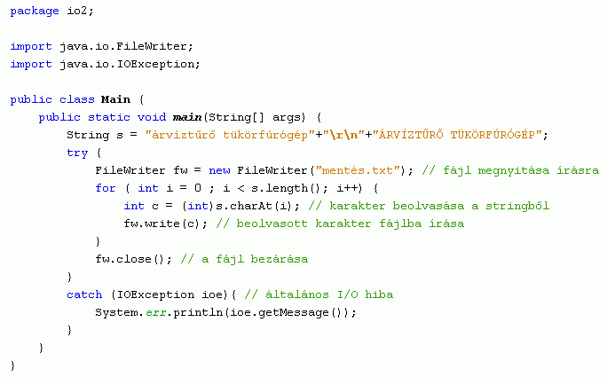 Karakteres állományok írására a FileWriter osztály write() metódusa áll rendelkezésre. Ehhez a metódushoz az IOException (általános i/o hiba) osztályt kötelező implementálni.