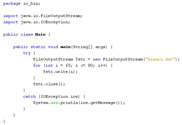A bináris adatokat tartalmazó állományok kezelését a FileInputStream és a FileOutputStream osztályok biztosítják. Mindkét osztályt importálni kell a java.io csomagból. Metódusaik a szokásos read(), write() és close(). Használatuk hasonló a karakteres állományoknál látottakhoz.