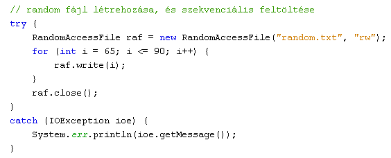 Az előző alfejezetek adatfolyam-kezelő műveletei mind soros hozzáférésűek voltak, tehát az állományok írása ill. olvasása az elejüktől a végükig sorban történt. Azonban lehetőség van arra is, hogy egy fájl tartalmához közvetlenül is hozzáférhessünk. Ezt a java.io csomag RandomAccessFile osztálya biztosítja. Ez az osztály egyszerre alkalmas olvasásra és írásra is, csupán a példányosítás során egy paraméterrel jelezni kell, hogy milyen műveletet kívánunk alkalmazni az objektumra: