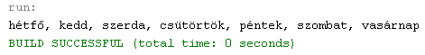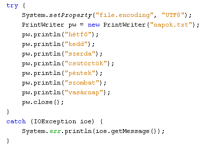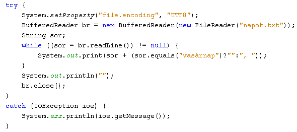 9.7.3. A PrintWriter és a BufferedReader osztályokat felhasználva írjuk ki a hét napjait soronként a napok.txt szöveges fájlba! Ezután olvassuk be a fájlt, és a napokat egy sorban, vesszővel elválasztva jelenítsük meg a képernyőn!