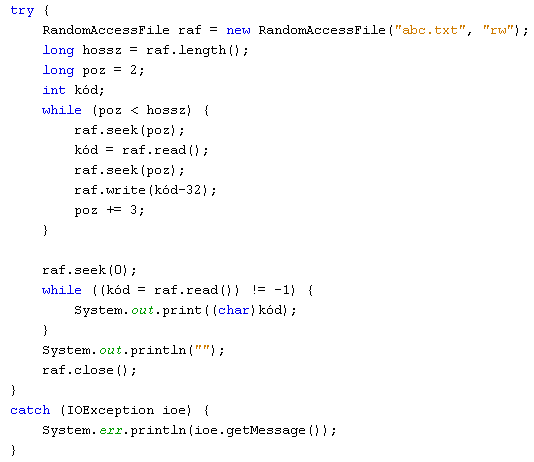9.7.4. A RandomAccessFile osztály metódusai segítségével cseréljük le az abc.txt fájl minden 3. betűjét nagybetűsre, majd a teljes fájlt írjuk ki a képernyőre!