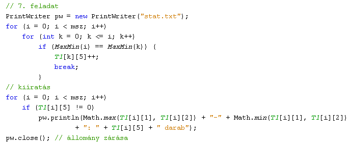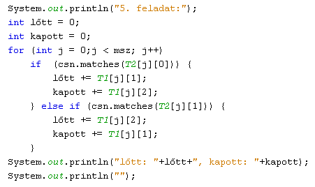 Figyeljük meg a második - beágyazott - for ciklus felépítését, amely az eredmények eltárolását végzi! Mindig csak addig fut - a tömb elejétől kezdve a vizsgálatot -, amíg nem talál egy olyan végeredményt, mint amilyet el akar tárolni. A kiíratásnál arra kell figyelni, hogy a teljes tömböt fel kell dolgozni, mivel egy eredmény akár a tömb utolsó sorában is szerepelhet! A gólszámok sorrendhelyes megjelenítéséhez a Math osztály max() és min() függvényei hathatós segítséget nyújtanak.