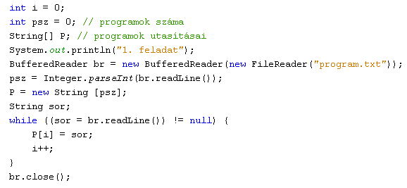 Első lépésként olvassuk be a Program.txt állományt! Első sora a programok számát tartalmazza, a többi sor pedig egy-egy programot. Utóbbiakat egy egyszerű string típusú P tömbben tároljuk.