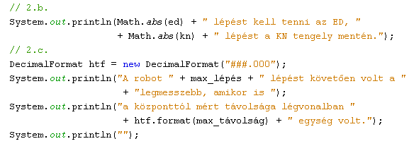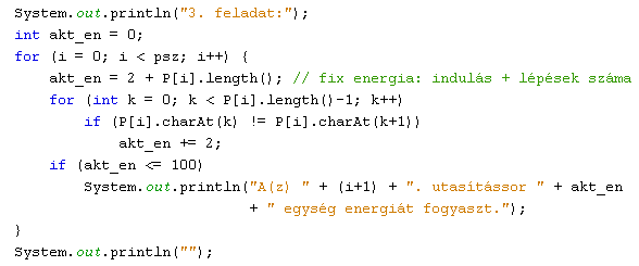 Figyeljük meg, hogy minden program rendelkezik egy fix energiaigénnyel, ami az indulásból és a megtett lépések számából adódik. Ezeken kívül már csak az irányváltásokat kell figyelni, amit két szomszédos utasítás különbözőségéből könnyen meghatározhatunk. Az utasítássor egy-egy elemét a String osztály charAt() metódusával könnyen meghatározhatjuk. Mivel mindig az aktuális utasítás kódját hasonlítjuk a sorban következőhöz, így a feldolgozó ciklus csak az utolsó előtti elemig fut!