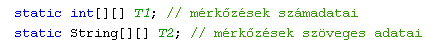 Olvassuk be a meccs.txt fájlban található adatokat! Tárolásukra két tömböt fogunk használni, mivel az adatok egy része egész számokat, másik része szöveget tartalmaz. Alkalmazzuk a "tömb a tömbben" módszert, mivel adategységenként (az inputfájl egy-egy sora) 5 szám- és 2 szövegadat tárolásáról kell gondoskodnunk. A tömböket statikus osztályváltozókként definiáljuk, mivel a későbbiekben egy saját metódussal - MaxMin()- fogunk hivatkozni rájuk.