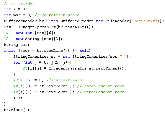 A megoldás a mérkőzések számának beolvasásával kezdődik, majd soronként feldolgozzuk az inputfájlt. Ez a StringTokenizer osztály metódusainak segítségével (a sort a szóközök mentén feldarabolva) könnyen megvalósítható. Figyeljük meg, hogy a tömbök indexelése 0-tól kezdődik!