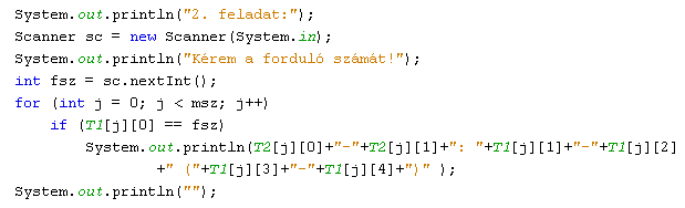 Egy forduló sorszámát bekérve írjuk ki a képernyőre az adott forduló mérkőzéseinek adatait a megadott formában.