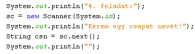 Egy csapat nevét kell bekérni a felhasználótól, majd (ez esetben egy csn változóban) eltárolva felhasználni a következő feladatok megoldásához.