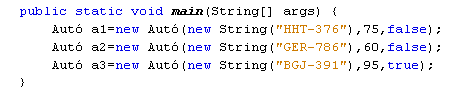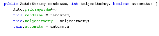 Definiáljunk egy egyszerű, általánosan elérhető Autó nevű osztályt, amelynek legyen három megfelelő típusú - minden más osztály elől rejtett - adattagja a rendszám, a teljesítmény és az automata váltó meglétének tárolására, valamint egy osztályszintű példányszámlálója: