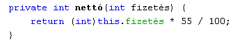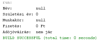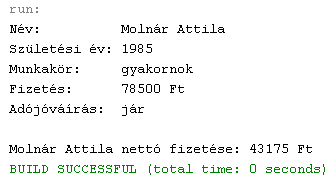 12.8.3. Hozzuk létre az osztály paraméter nélküli konstruktorát, amely segítségével példányosítsunk egy újabb dolgozót! Adattagjai milyen értékeket vettek fel? Írjuk felül őket a d4-es dolgozó adataival, kivéve a nevet és a születési évet, amely Molnár Attila (szül. 1985) legyen! Írjunk egy példánymetódust a nettó fizetés kiszámítására! A levonások összesen 45%-ot tesznek ki. Mennyi a nettó bére az új dolgozónak?