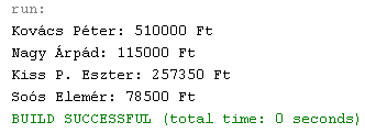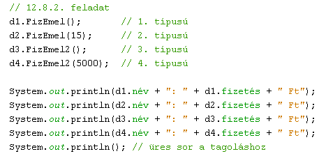 A minimálbér összegét definiáljuk végleges osztályváltozóként, és ennek megfelelően módosítsuk a "minimálbéres" konstruktort! A dolgozókat (d1, ... d4) rendre rendkívüli, 20%-os, jogszabály szerinti, ill. 5.000 Ft-os általános fizetésemelésben részesítsük, majd jelenítsük meg képernyőn a nevüket és az új fizetésüket! Mennyi lett az új átlagfizetés?