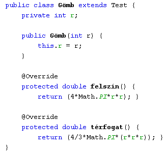 Figyeljük meg az ősosztályban absztraktként definiált felszín() és térfogat() metódusok implementálását!