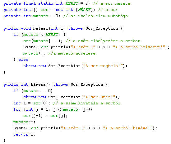 14.8.4. Írjunk programot egy 3 db egész szám tárolására szolgáló sor adatszerkezet modellezésére. Típusa "fix kezdetű" legyen, azaz a sor első eleme mindig a sor első tárhelyén helyezkedjen el! Implementáljuk a sorba való behelyezést és a sorból való kivételt úgy, hogy ezen műveletek hibájának lekezelésére saját kivételosztályt használjunk, és a hiba okát is jelenítsük meg!