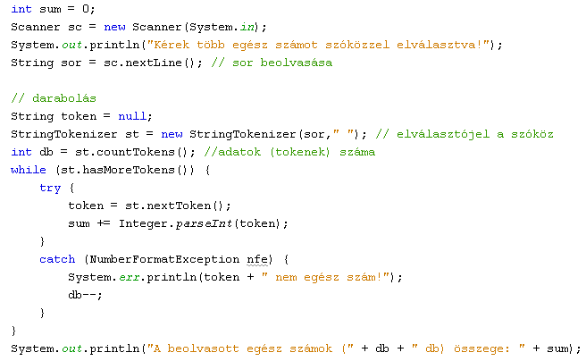 14.8.2. Egészítsük ki a 9. fejezet io_token.java programját úgy, hogy hibás inputadatok bevitele esetén is működjön, és csak az egész számokat adja össze! A hibás adatok NumberFormatException kivételt váltanak ki. Elválasztójel a szóköz legyen! Pl. a 23 44,4 12 k 10 bemenő adatokból kiszűrhető egész számok összege 23+12+10=45 jelenjen meg a képernyőn! A végeredmény mellett a hibás adatok is kerüljenek kiírásra!