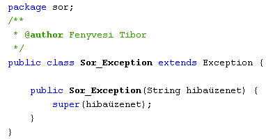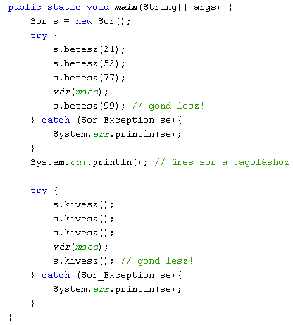 A kivételosztályunk felépítése és a program main metódusa nagyon hasonló a verem implementációjánál alkalmazottakhoz: