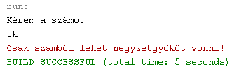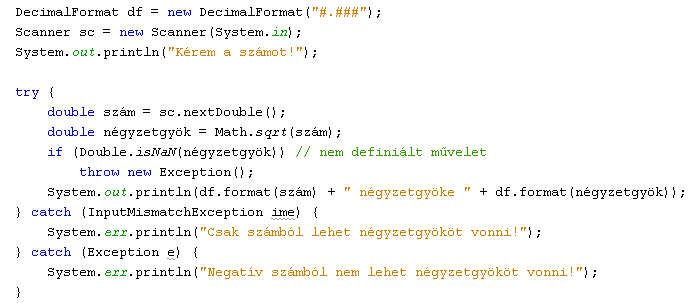 kivételt dobhat, ha nem számkaraktert írunk be. Viszont a negatív számból való négyzetgyökvonás a Java