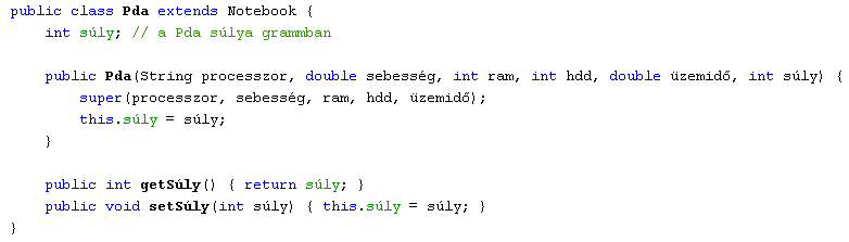 15.4.2. Származtassunk a Notebook osztályból egy Pda osztályt! Az új osztály objektumai a notebook tulajdonságain kívül egy új - egész értékű - súly adattaggal is rendelkeznek, amely a pda súlyát tárolja grammban kifejezve. Készítsünk az új adattaghoz lekérdező és beállító metódust, valamint az osztályhoz egy konstruktort, amellyel mindegyik adattagjának kezdőérték adható!