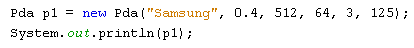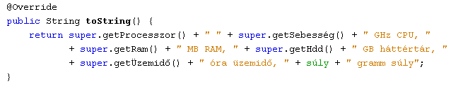 15.4.3. Definiáljuk felül a Pda osztály Notebook osztálytól örökölt toString() metódusát úgy, hogy az örököltek mellett a súly adattagot is jelenítse meg, valamint a hdd adattag megjelenített neve "HDD" helyett "háttértár" legyen! Az alábbi pda példányt hozzuk létre, és jelenítsük meg a képernyőn!
